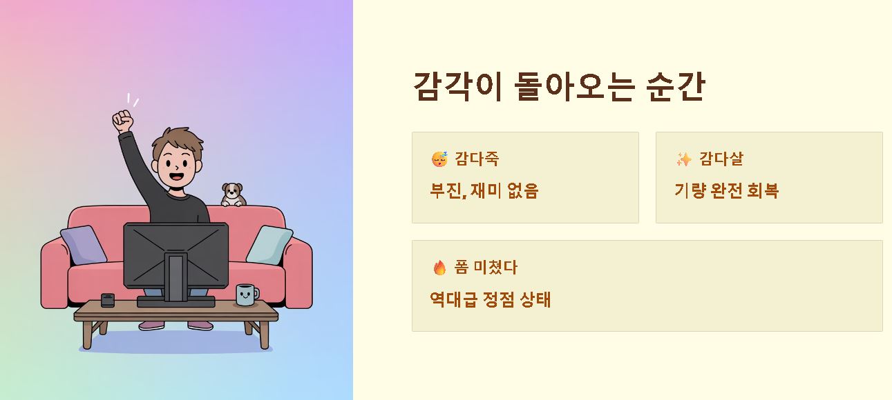 - 기량 회복의 상징: 한동안 재미가 없거나 실력이 떨어졌던 사람에게 쓰던 "감 다 죽었네(감다죽)"의 반대 개념이에요. 다시 예전의 날카로운 기량을 회복했을 때 축하와 감탄의 의미로 쓰여요.