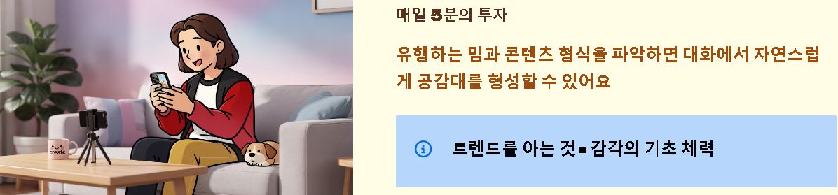 - 트렌드 파악하기: 요즘 유행하는 숏폼 콘텐츠를 가볍게 훑어보는 것만으로도 대화의 '감'을 잃지 않을 수 있어요.