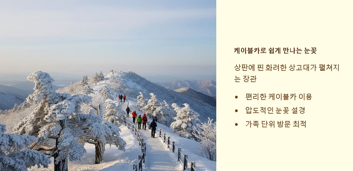 - 덕유산 향적봉: 케이블카를 타고 쉽게 올라가 상판에 핀 화려한 눈꽃(상고대)을 감상할 수 있습니다.
