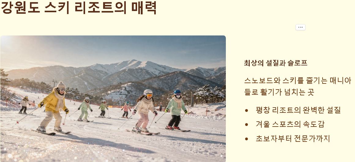 - 평창 리조트: 최상의 설질을 갖춘 슬로프에서 스키와 보드를 즐기며 겨울의 속도감을 느낄 수 있습니다.
