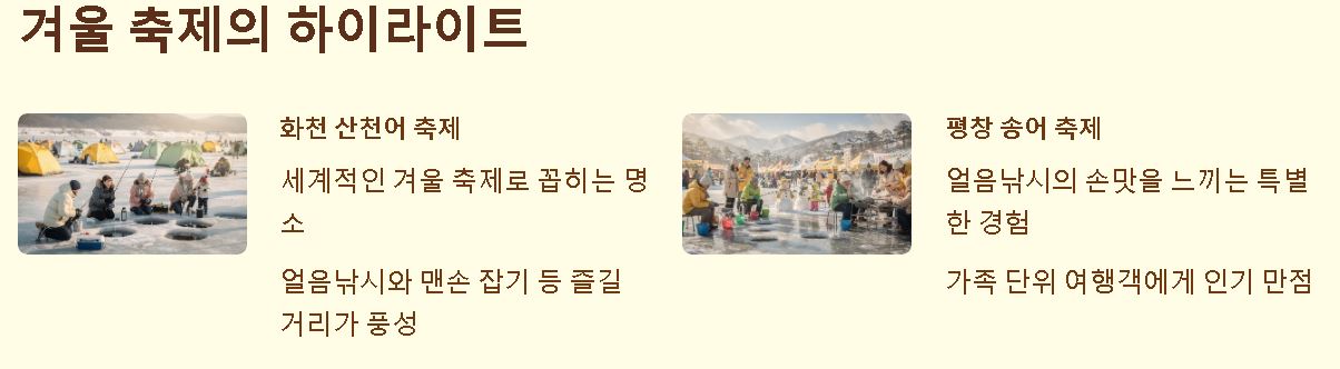 빠른요약: 화천 산천어 축제, 평창 스키장 등 겨울 레포츠와 축제를 즐길 수 있는 장소들입니다.