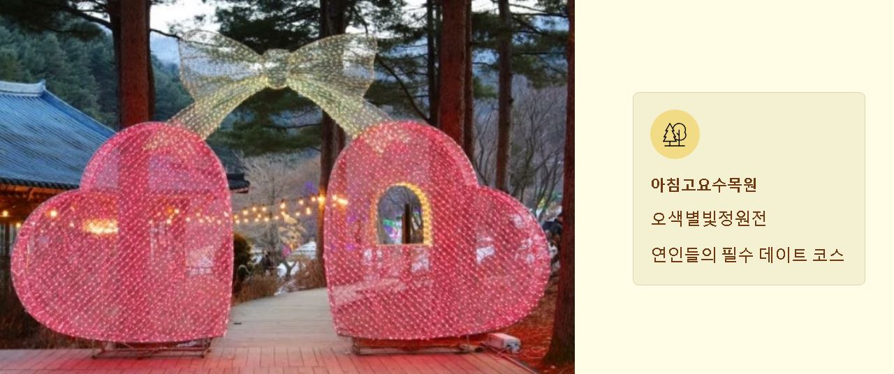 - 아침고요수목원: 밤하늘 아래 펼쳐지는 화려한 조명 축제가 잊지 못할 낭만을 선사합니다.