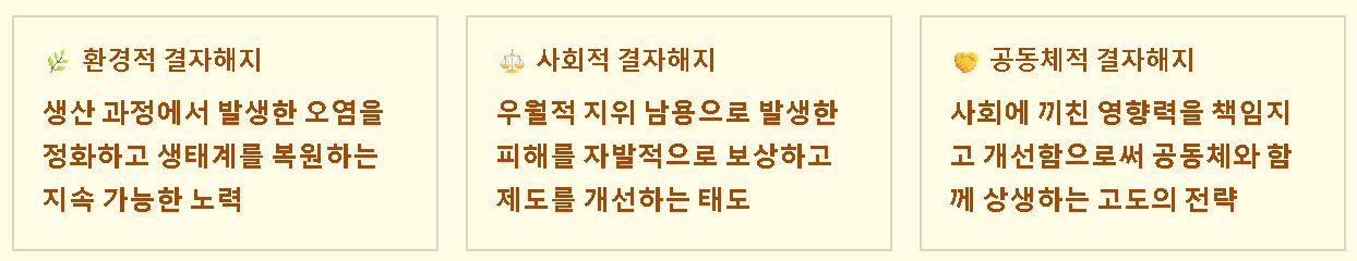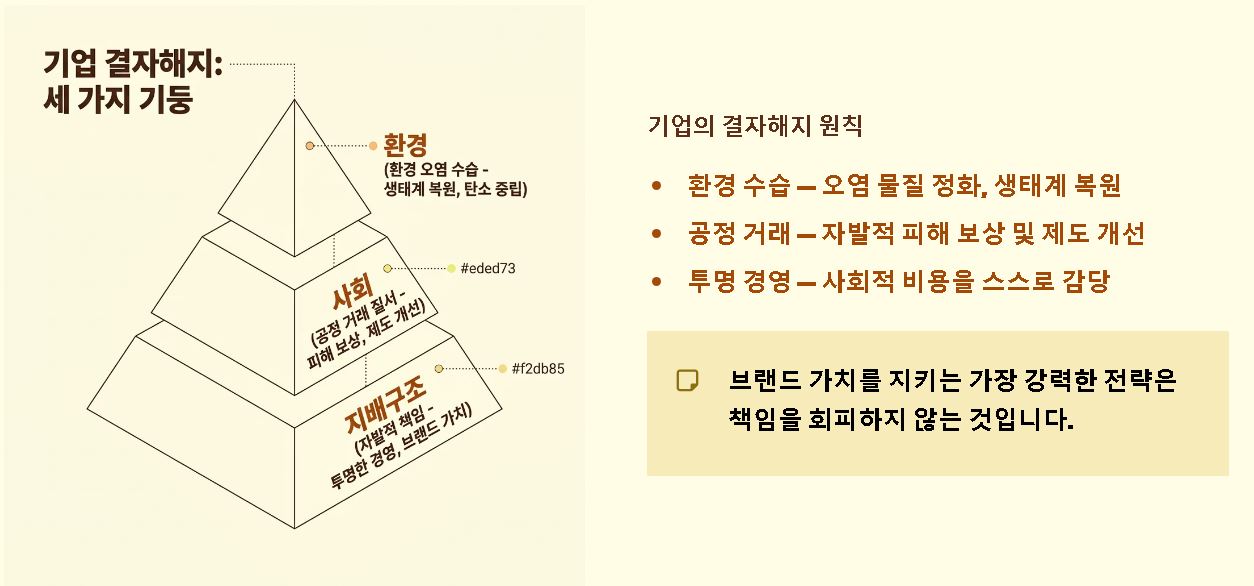 요약: 기업의 결자해지는 사회에 끼친 영향력을 책임지고 개선함으로써 공동체와 함께 상생하려는 고도의 전략적 가치입니다.