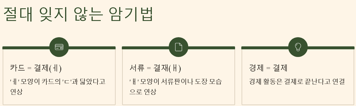 - 결제(카드): '제'의 'ㅔ' 모양이 카드(Card)의 'ㄷ'과 닮았다고 연상하세요.