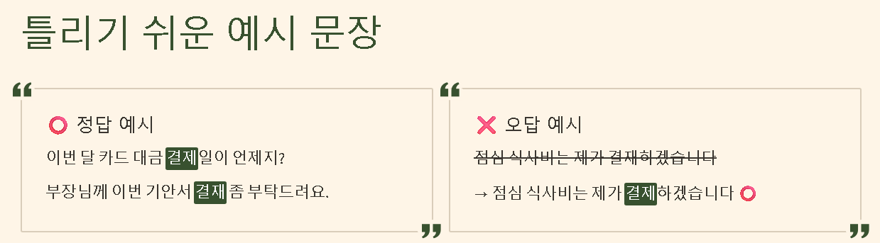 - (X) 점심 식사비는 제가 결재하겠습니다. (→ 결제)