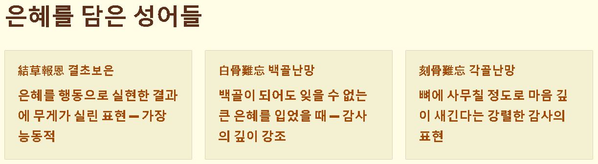 - 보은(報恩): 받은 친절이나 도움을 잊지 않고 반드시 되돌려주는 유교적 가치관의 핵심 덕목을 의미합니다.