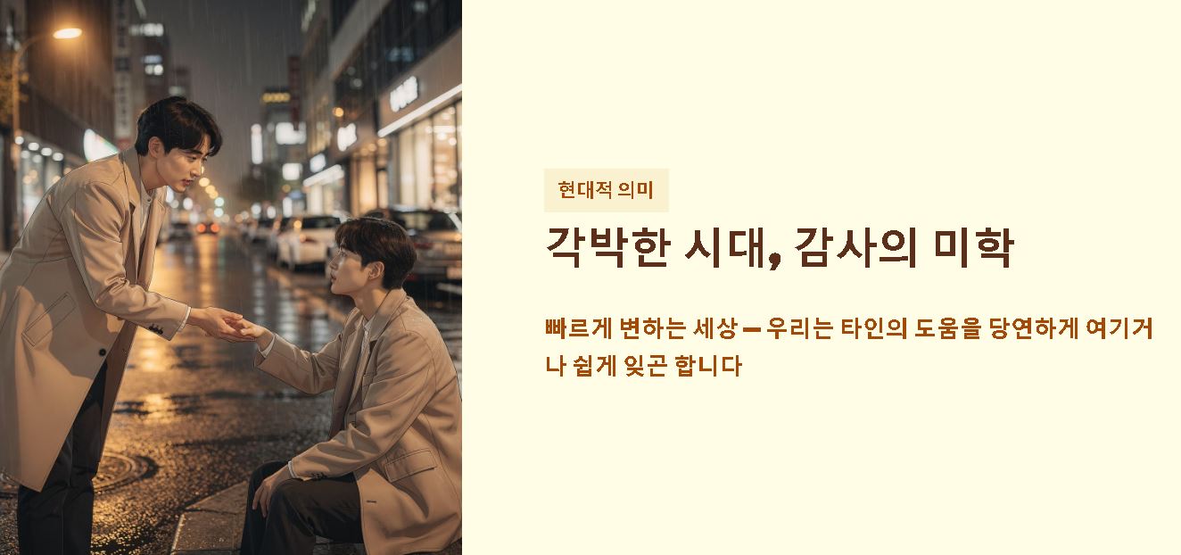 - 어려울 때의 조력: 과거에 도움을 주었던 이가 곤경에 처했을 때 먼저 손을 내미는 용기가 진정한 보은의 실천입니다.
