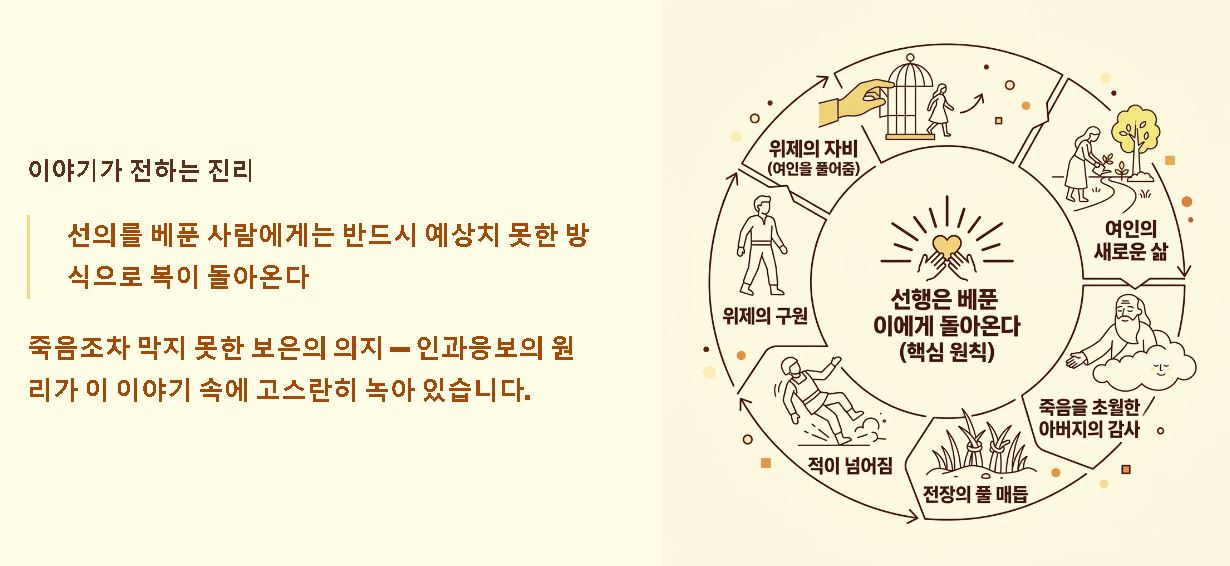 요약: 선의를 베푼 사람에게는 반드시 예상치 못한 방식으로 복이 돌아온다는 인과응보의 원리가 잘 녹아 있는 이야기입니다.