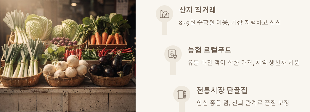 - 지역 농협 로컬푸드 매장은 유통 마진이 적어 가격이 착한 경우가 많습니다.