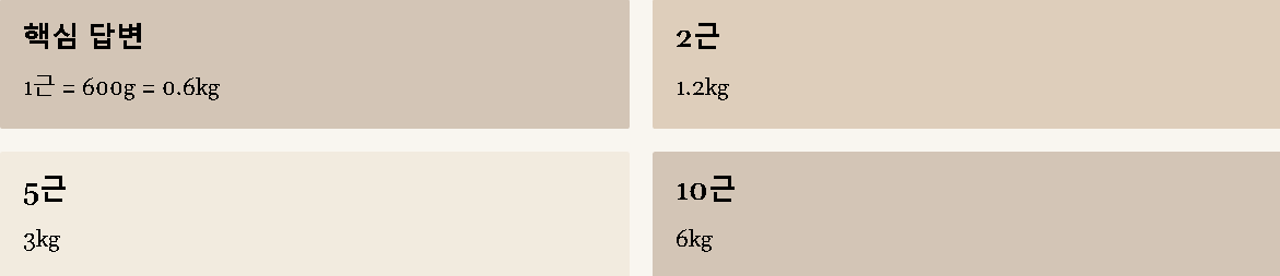 한 번만 “1근=600g”을 기준으로 잡아두면, 다음부터는 계산이 훨씬 편해져요.