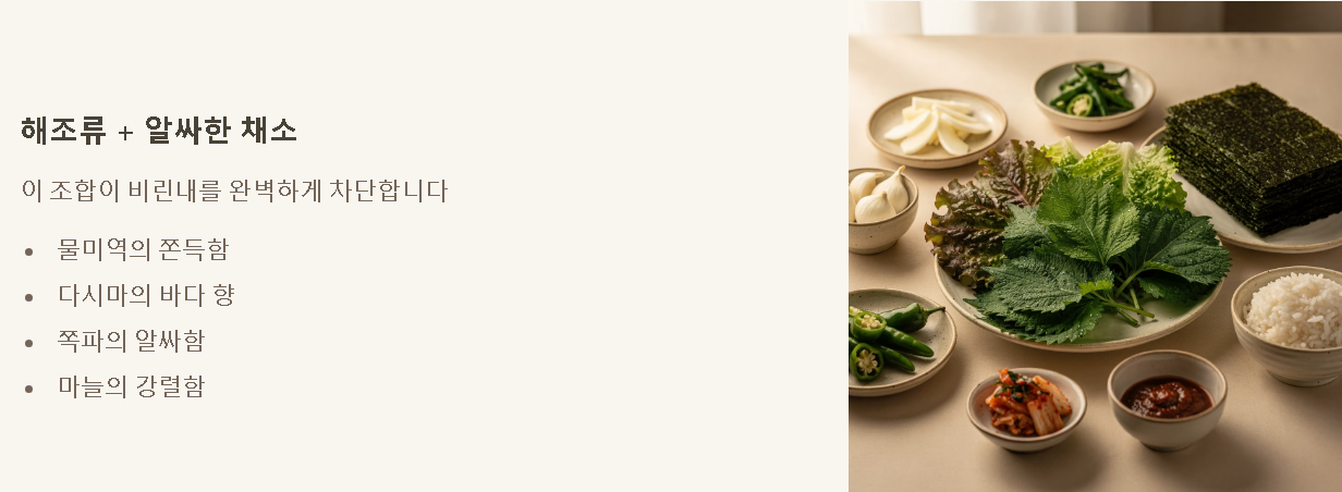 - 물미역과 다시마: 바다 향으로 비린 맛을 덮어주고 쫀득한 식감을 더해줍니다.