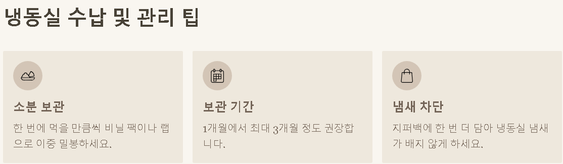 - 냉동실 냄새가 배지 않도록 지퍼백에 한 번 더 담아 보관하면 훨씬 깔끔합니다.