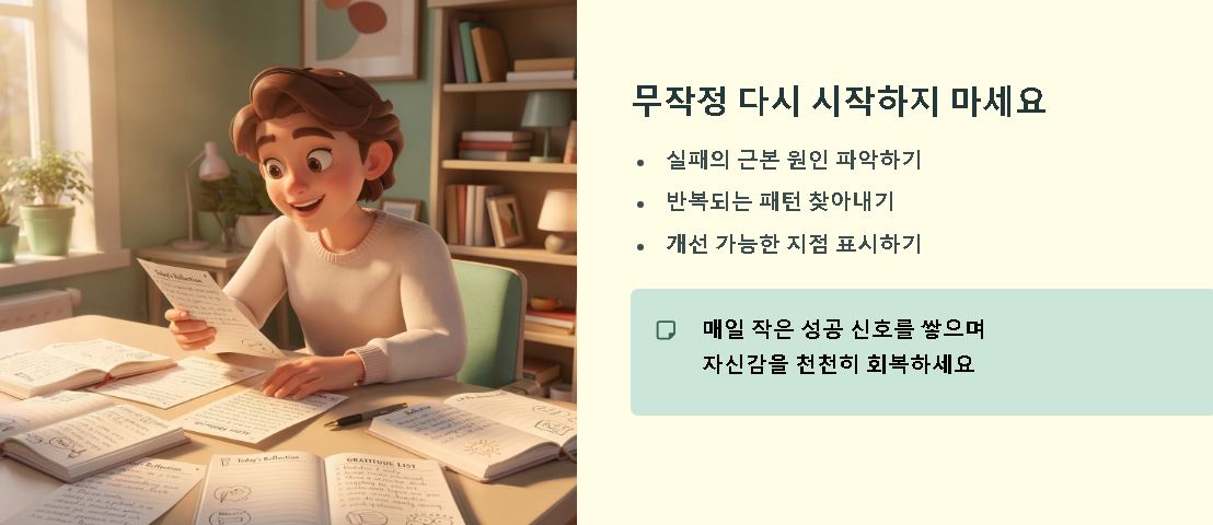 무작정 다시 시작하기보다 왜 실패했는지 원인을 파악하는 과정이 선행되어야 시행착오를 줄이는 기준을 잡을 수 있어요. 집에서 하기 쉽게 매일 작은 성공 신호를 쌓으며 자신감을 회복하면, 어느덧 흙먼지를 일으키며 다시 도전할 수 있는 튼튼한 발판이 마련된답니다.