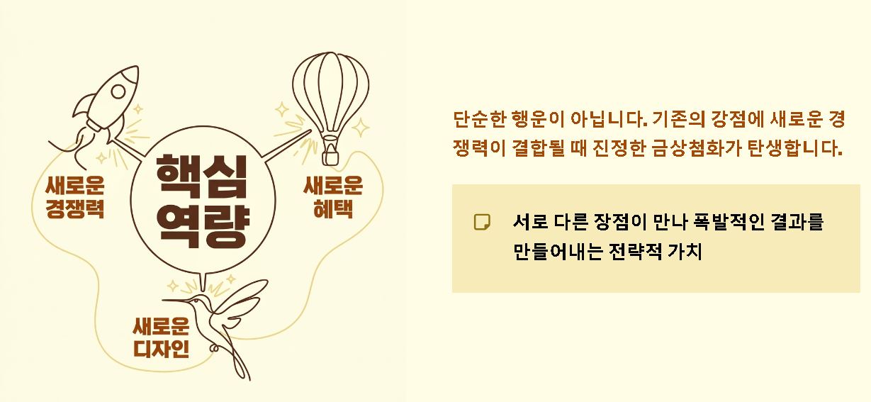 단순히 운이 좋은 것을 넘어, 기존의 강점에 새로운 경쟁력이 결합될 때 우리는 진정한 금상첨화를 경험하게 됩니다. 서로 다른 장점이 만나 폭발적인 결과를 만들어내는 전략적 가치로도 해석이 가능합니다.