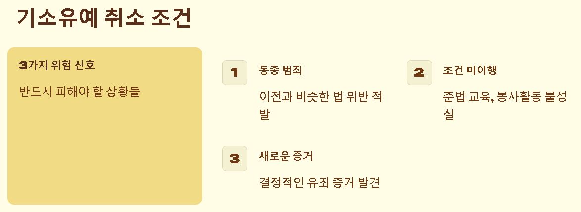 - 조건 미이행: 준법 교육이나 봉사활동 등 조건을 걸고 받은 유예를 성실히 따르지 않았을 때 발생해요.
