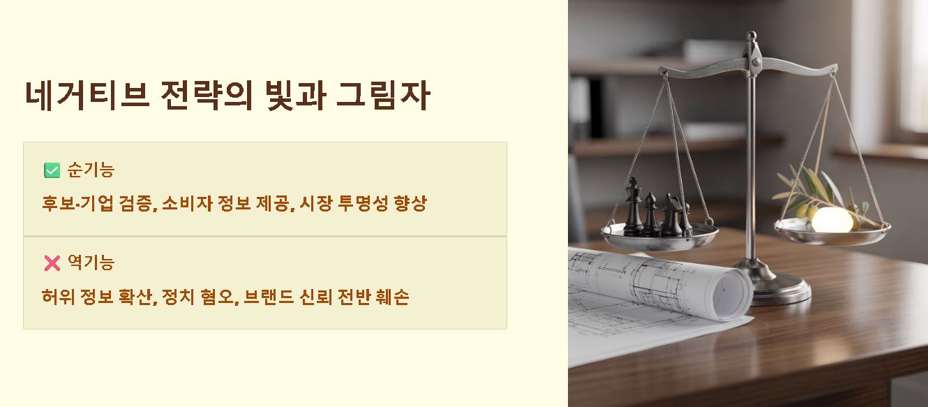 요약: 정치적 네거티브는 상대의 약점을 공략해 승리를 쟁취하려는 공세적 수단이며, 검증과 비방이라는 양날의 검을 가진 여론전의 핵심 기제입니다.