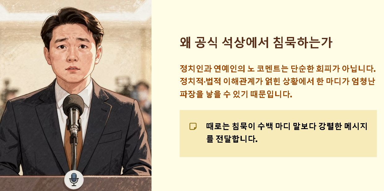 - 법적 분쟁 진행 중: 재판이나 수사가 진행 중인 사건에 대해 언급하는 것이 결과에 악영향을 미칠 수 있을 때, 법률 대리인의 조언에 따라 철저한 침묵을 유지하는 경우가 많습니다.