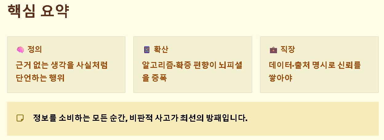 - 검증 절차의 생략: 정보를 접할 때 출처를 확인하기보다 자신의 감정에 부합하면 즉시 사실로 받아들이는 태도가 문제입니다.