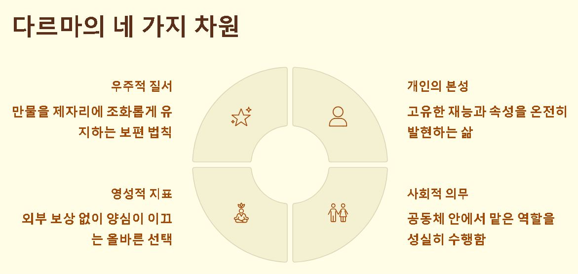 - Q: 개인의 욕망과 다르마가 충돌할 땐 어떡하죠? 일시적인 즐거움을 주는 욕망보다 장기적으로 자신과 타인에게 평화를 주는 선택이 무엇인지 고민하는 지혜가 필요합니다.