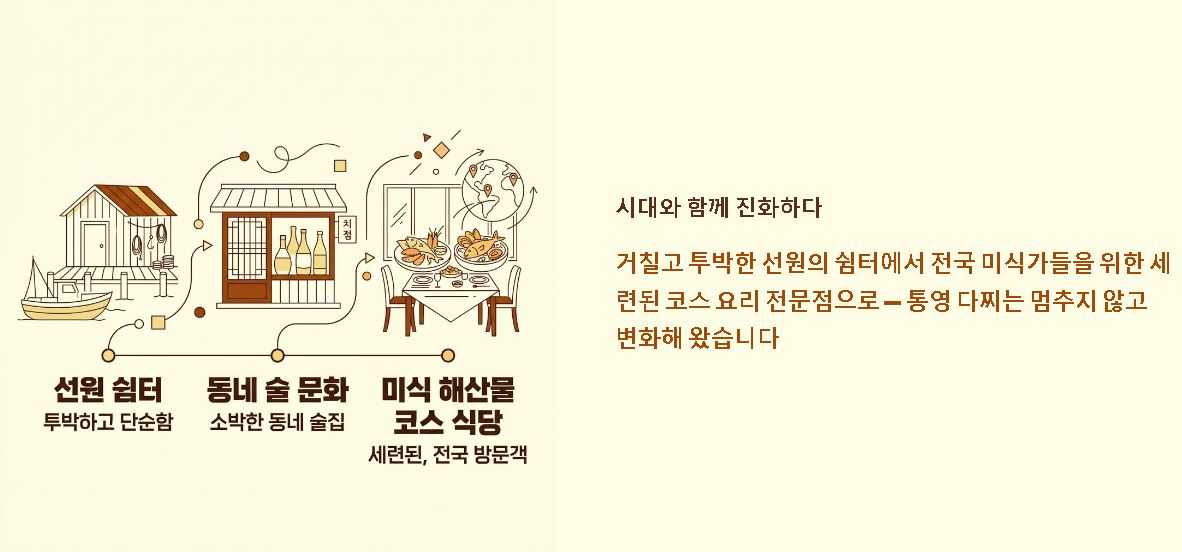 - 시대에 따른 변화: 과거에는 거칠고 투박한 선원들의 쉼터였다면, 현재는 전국 각지에서 찾아오는 미식가들을 위한 세련된 한식 코스 요리 전문점으로 진화했습니다.