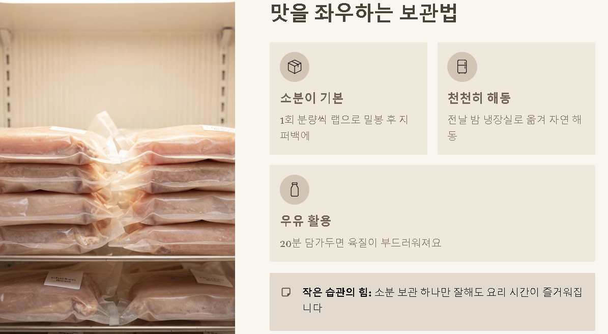 레시피만큼이나 중요한 게 재료를 어떻게 관리하느냐인 것 같아요. 냉동실에 오래 두면 냄새가 나기 쉬운데, 평소에 소분 보관만 잘해둬도 요리 시간이 훨씬 즐거워지고 맛의 질도 달라집니다.