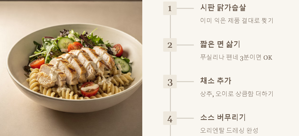 요즘 마트에 잘 나오는 조리된 닭가슴살 제품을 활용하면 시간은 더 단축돼요. 이미 익어있는 제품이라 살짝 데우기만 하면 되는데, 여기에 짧은 면이나 푸실 리를 삶아 섞어주면 한 끼 식사로도 손색없답니다.
