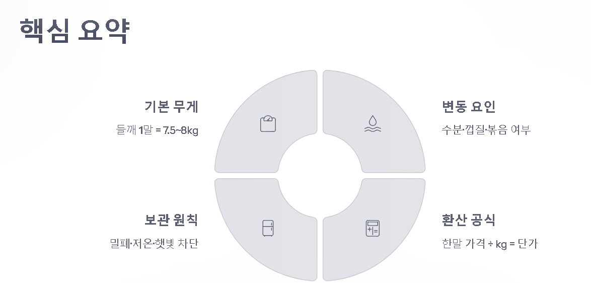 거래에서 손해 보지 않으려면 반드시 “1말이 몇 kg 기준인지”를 확인한 뒤 kg 단가로 환산해야 합니다.