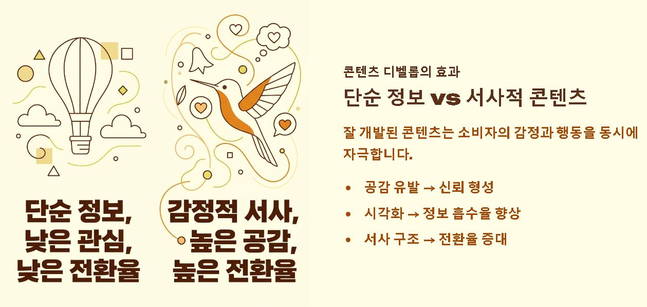 요약: 콘텐츠의 디벨롭은 소비자가 해당 정보를 어떻게 받아들일지 세밀하게 설계하여 전환율을 높이는 핵심 전략입니다.