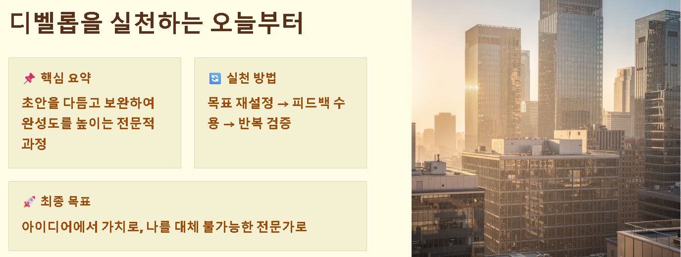 요약: 효과적인 디벨롭은 유연한 사고방식과 철저한 검증을 통해 기획의 밀도를 높여가는 일련의 반복 과정입니다.
