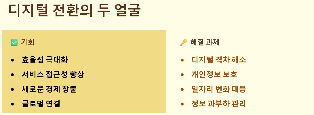 단순히 기기를 사용하는 수준을 넘어 정치, 경제, 문화 등 사회 전반의 질서가 바뀌는 과정을 전환(Transformation)이라고 합니다. 물리적 공간의 제약이 사라지고 데이터가 중심이 되는 사회로 나아가고 있는 것인데요. 디지털은 이제 단순한 기술을 넘어 우리가 세상을 바라보고 관계를 맺는 방식을 근본적으로 재정의하고 있습니다.