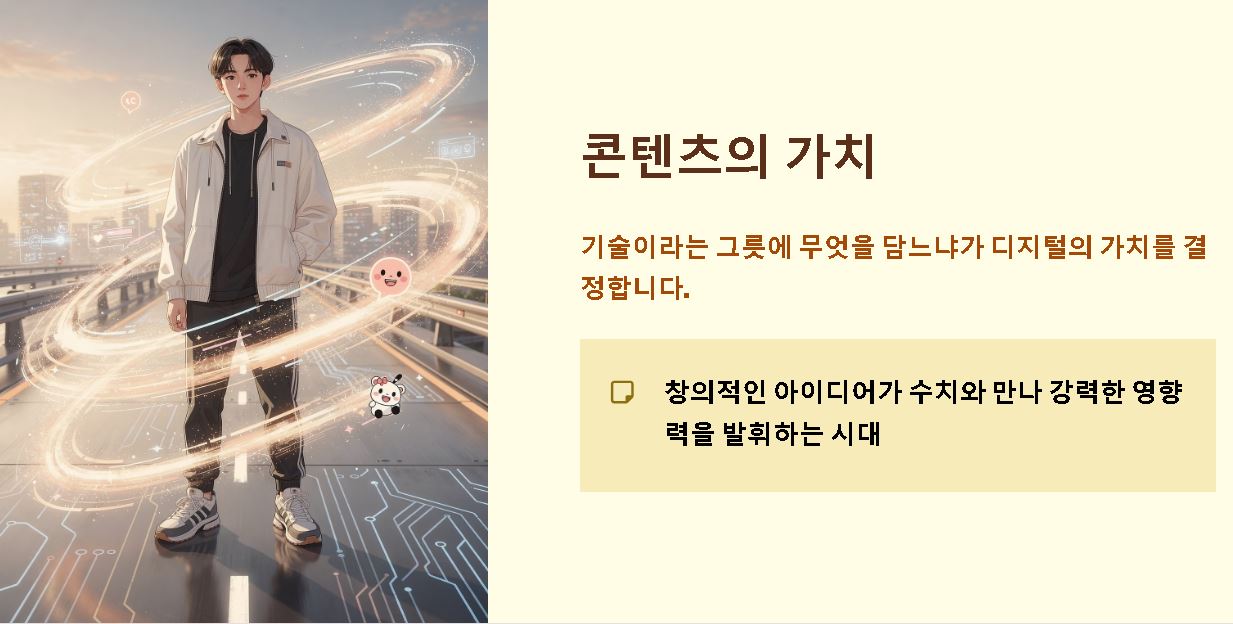물리적인 형태가 없는 정보는 인터넷이라는 고속도로를 타고 순식간에 퍼져나갑니다. 이 과정에서 콘텐츠 뜻을 명확히 이해하는 것은 매우 중요한데요. 기술이라는 그릇 안에 무엇을 담느냐에 따라 디지털의 가치가 결정되기 때문입니다. 창의적인 아이디어가 수치와 만나 강력한 영향력을 발휘하는 시대입니다.