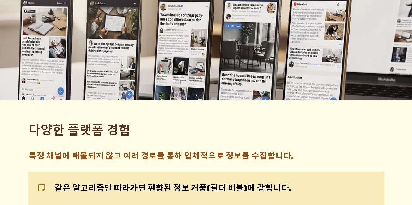 - 다양한 플랫폼 경험: 특정 채널에 매몰되지 않고 여러 경로를 통해 입체적으로 정보를 수집하여 편향된 시각에서 벗어나는 연습을 지속해야 합니다.