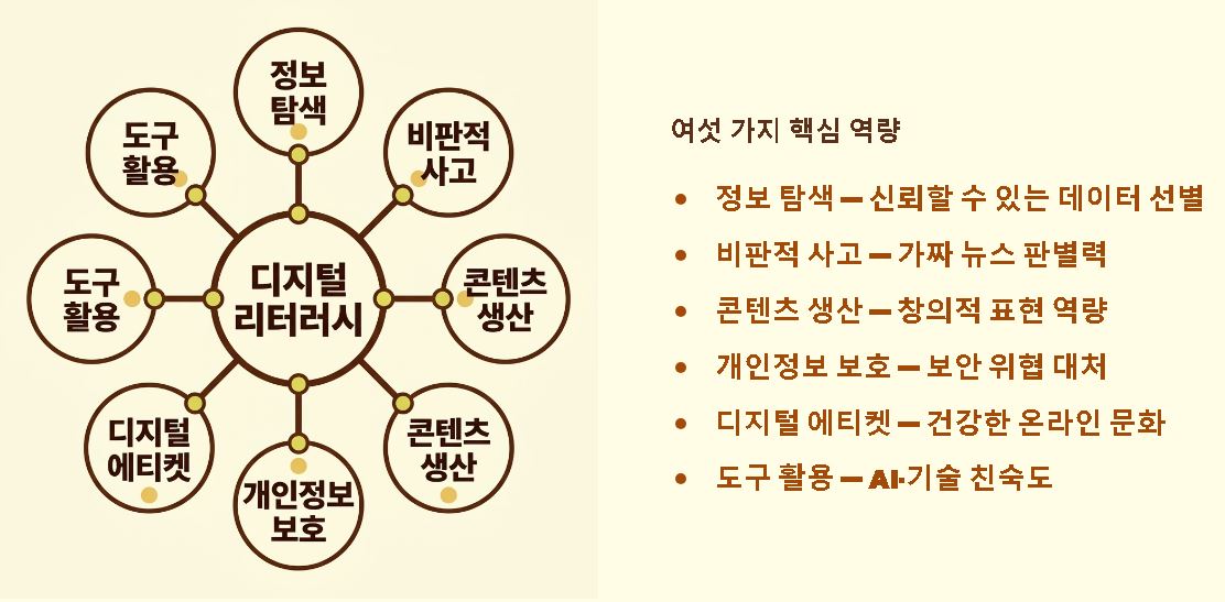 요약: 디지털 리터러시는 디지털 환경에서 정보를 올바르게 읽고, 분석하며, 안전하게 소통하는 모든 지적 활동의 총합입니다.