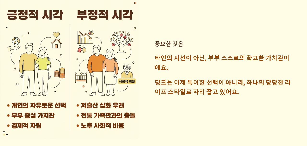 - 가치관의 변화: 전통적인 '결혼=출산'이라는 공식에서 벗어나, 개인의 행복과 부부간의 친밀도를 최우선으로 생각하는 현대적인 가치관이 반영되어 있어요.