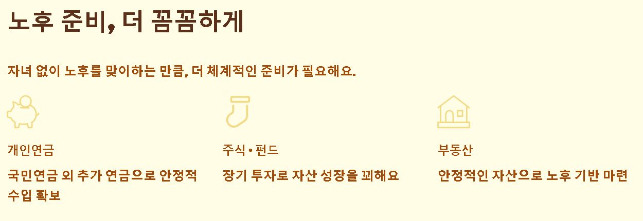 - 확실한 노후 대책: 자녀라는 인적 보험이 없기 때문에 개인연금이나 주식, 부동산 등을 통해 스스로 노후 자금을 더 완벽하게 마련해둬야 해요.