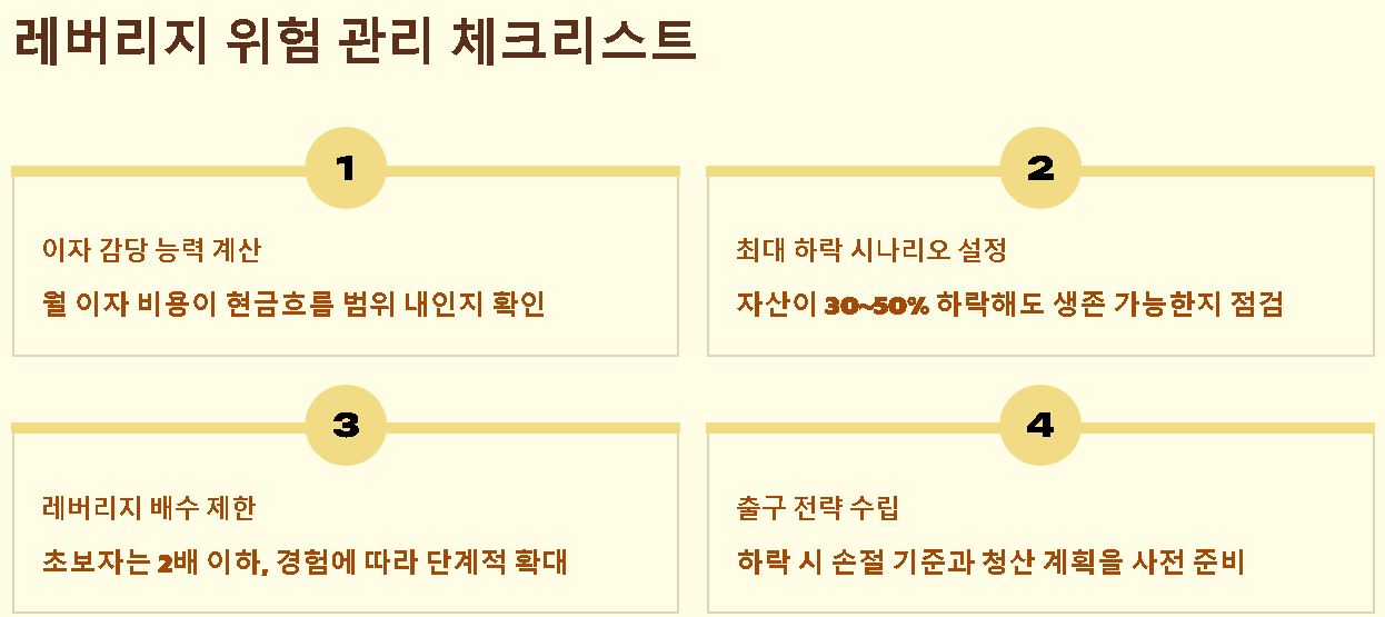 - Q: 적절한 레버리지 비율은 어느 정도인가요? 개인의 현금 흐름과 위기 대응 능력에 따라 다르지만, 보통 원금의 20~30% 이내의 부채 비율이 심리적 안정감을 유지하기 좋습니다.