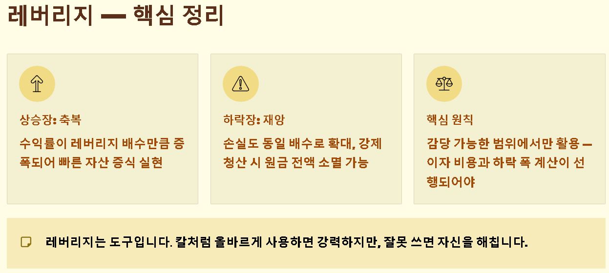 - Q: 무조건 빚을 내서 투자하는 게 유리한가요? 아니오. 자산의 기대 수익률이 빌린 돈의 이자 비용보다 확실히 높을 때에만 정(+)의 레버리지가 발생합니다.