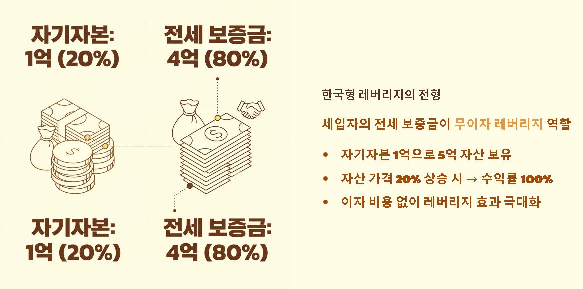 - 부동산 전세 끼고 매수: 세입자의 전세 보증금을 무이자로 빌려 집을 사는 '갭투자'는 한국 시장의 전형적인 레버리지 활용 방식입니다.