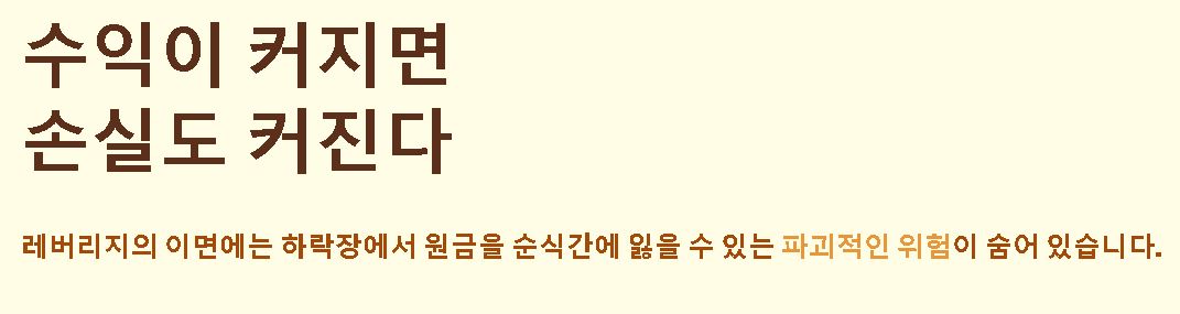 요약: 레버리지는 타인 자본을 활용해 총투자 규모를 키움으로써 하락 시의 위험을 감수하는 대신 상승 시의 수익을 극대화하는 전략입니다.