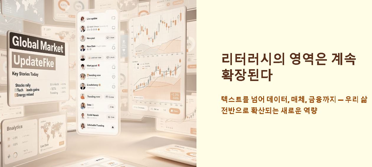기술이 발전함에 따라 리터러시의 영역은 텍스트를 넘어 데이터, 매체, 금융 등 우리 삶 전반으로 확장되고 있습니다. 자신이 강한 분야와 보완해야 할 리터러시 영역을 파악하는 것이 개인 경쟁력의 시작입니다.
