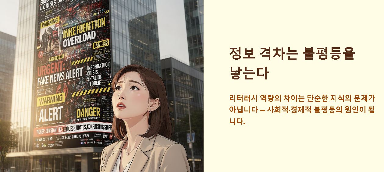 리터러시 역량의 격차는 단순한 지식의 차이를 넘어 사회적, 경제적 불평등으로 이어지는 '정보 격차'의 원인이 됩니다. 잘못된 정보에 선동당하거나 기회를 놓치지 않기 위한 방어 기제가 필요합니다.