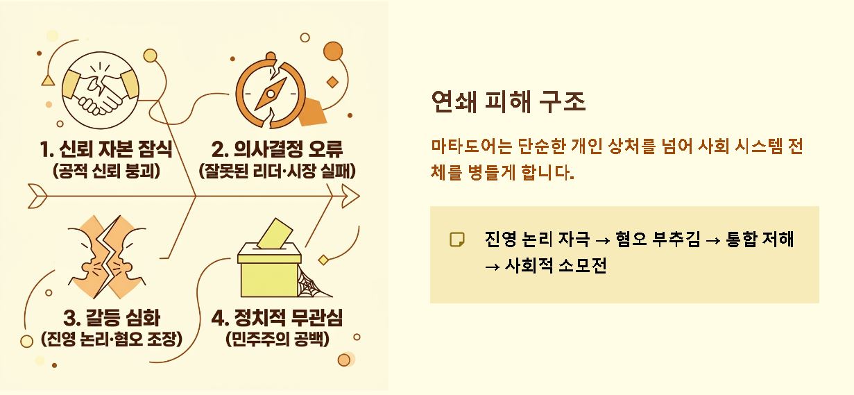 요약: 마타도어는 사회적 신뢰를 무너뜨리고 합리적인 의사결정을 방해하여 공동체의 발전을 가로막는 장애물입니다.