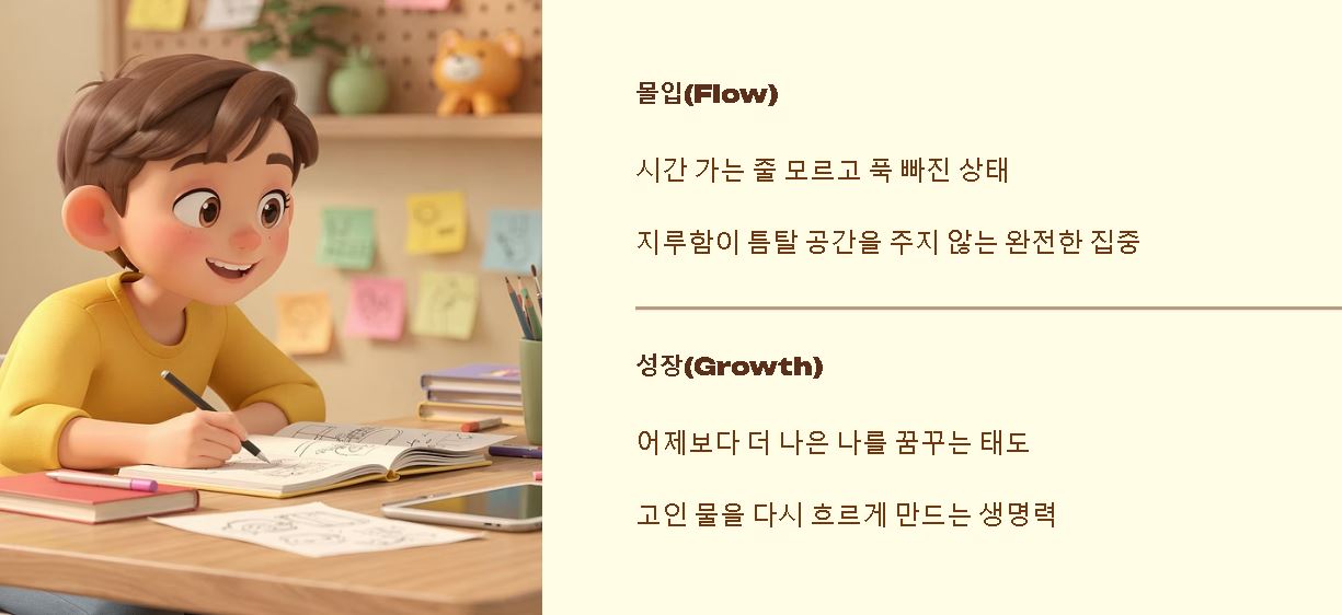 - 즉각적 피드백: 내가 잘하고 있는지 확인할 수 있는 지표를 설정하면 더 깊이 몰입하게 됩니다.