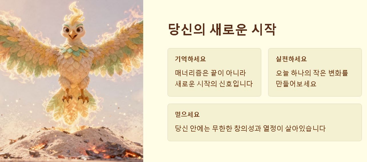 오늘은 지루한 일상을 깨뜨려 줄 매너리즘의 반대말과 긍정적인 가치들에 대해 두루 정리해놨어요. 뻔한 반복에 지칠 때마다 창의성, 열정, 몰입이라는 단어들을 떠올리며 나만의 새로운 색깔을 찾아가시길 바랍니다. 오늘 정리한 정보가 여러분의 지친 일상에 활력을 불어넣는 기분 좋은 자극제가 되었기를 바랍니다. 늘 평안하고 기쁨 가득한 하루 보내세요!