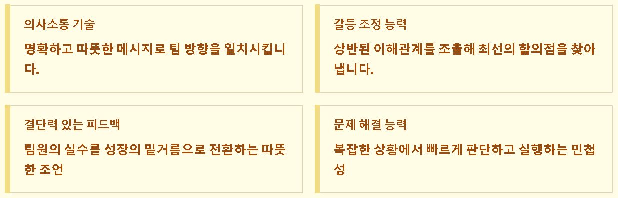 - 결단력 있는 피드백: 팀원의 실수를 성장의 밑거름으로 삼을 수 있도록 명확하면서도 따뜻한 조언을 건넬 줄 알아야 합니다.