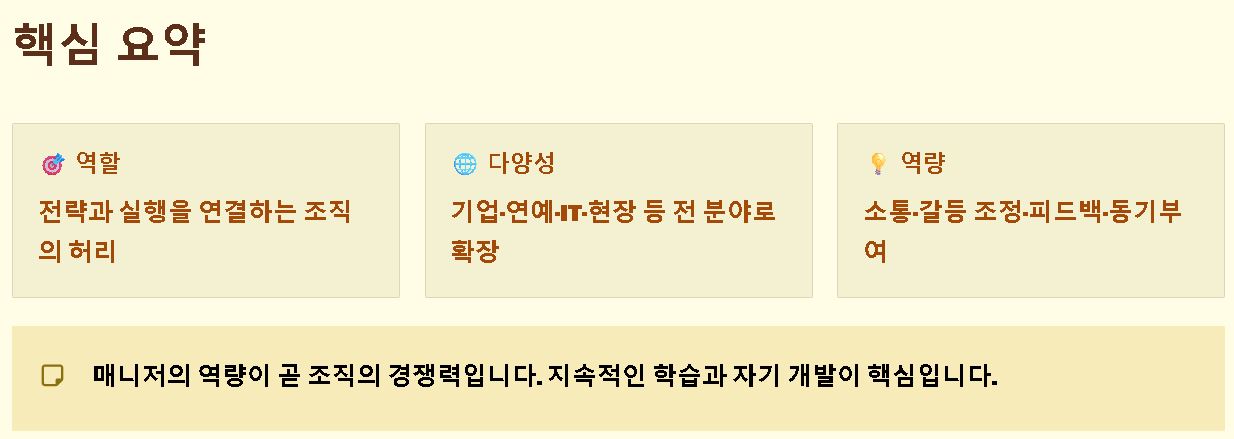 요약: 매니저는 한정된 자원을 활용해 최적의 성과를 도출하고 조직의 지속 가능성을 담보하는 실질적인 운영 주체입니다.