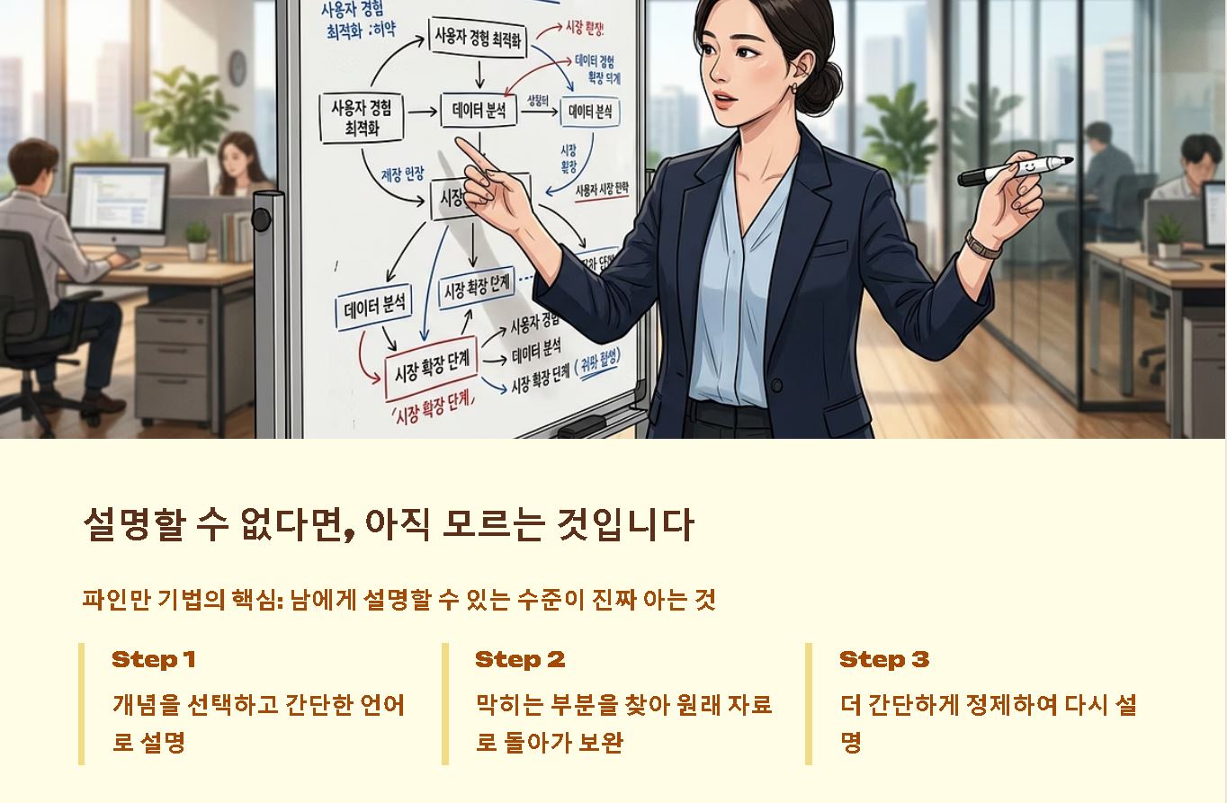 - 말하며 설명하기: 누군가를 가르치듯 설명해보면 모르는 지점이 어디인지 즉각 파악됩니다.