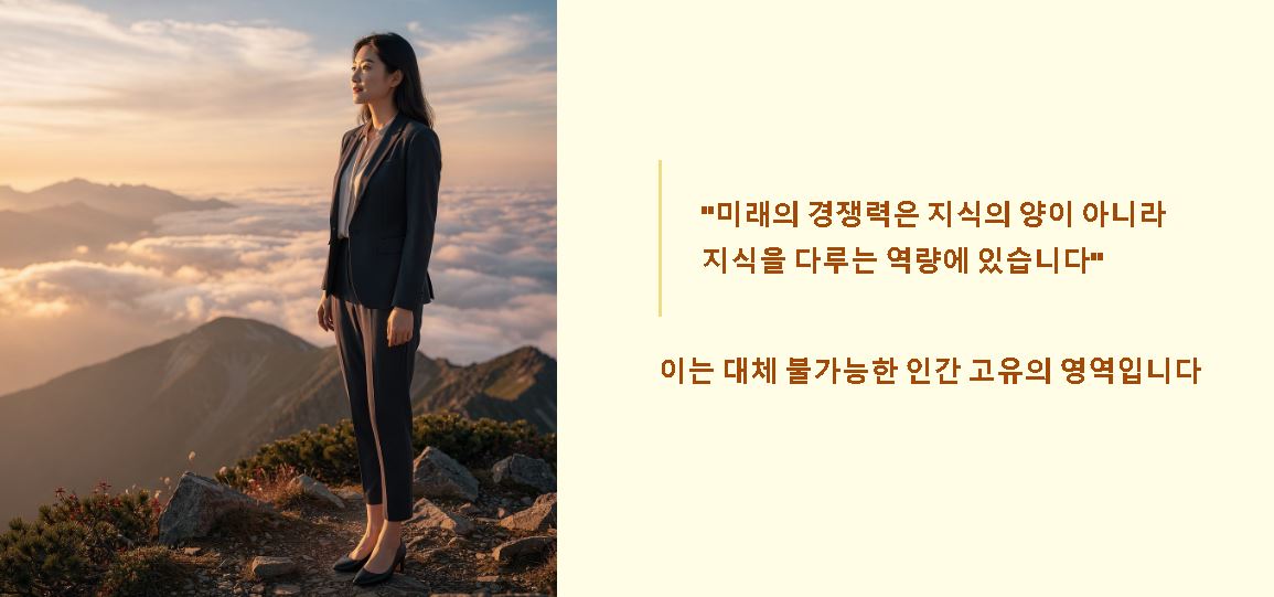 요약: 미래의 경쟁력은 지식의 양이 아니라 지식을 다루는 역량에 있으며, 이는 대체 불가능한 인간 고유의 영역입니다.