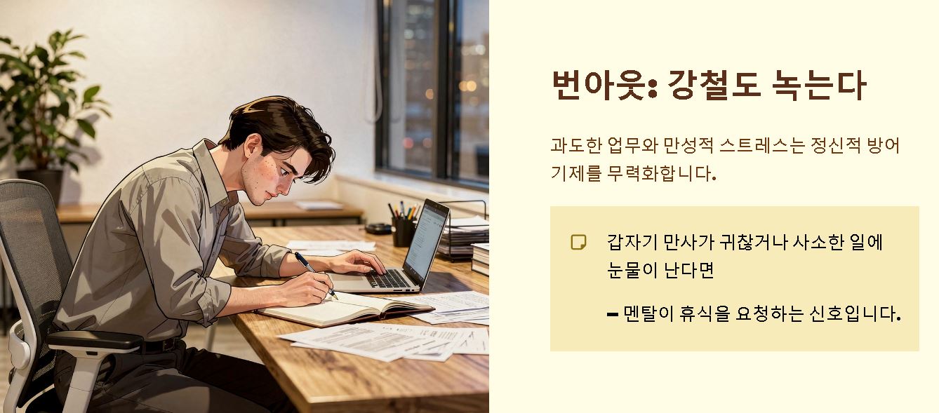 강철 같은 멘탈을 가진 사람이라도 에너지가 소진되면 한순간에 무너질 수 있습니다. 특히 과도한 업무나 만성적인 스트레스는 '번아웃(Burnout)'을 유발하여 정신적 방어 기제를 무력화하는데요. 갑자기 만사가 귀찮아지거나 사소한 일에도 눈물이 나는 등의 증상이 나타난다면 이는 멘탈이 휴식을 갈구하고 있다는 위험 신호로 받아들여야 합니다.