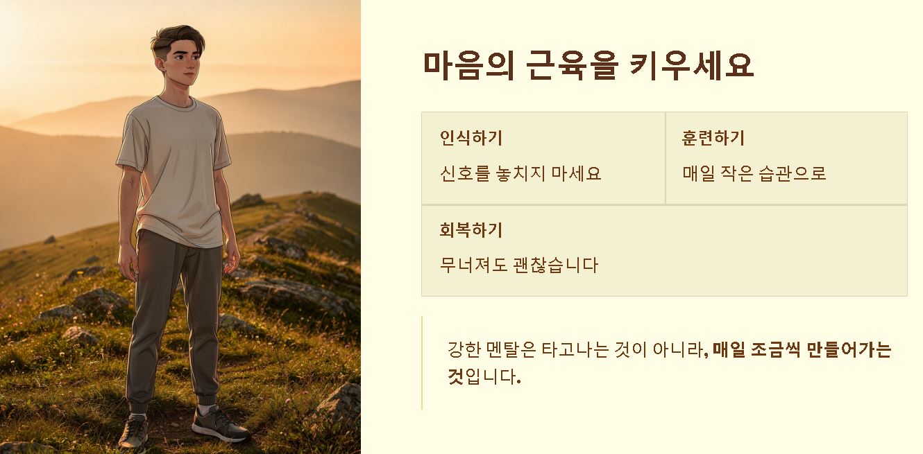 - Q: 멘탈이 원래 약한 사람도 강해질 수 있나요? 네, 멘탈은 근육과 같아서 작은 시련부터 이겨내는 연습을 하면 누구나 단단해질 수 있습니다.